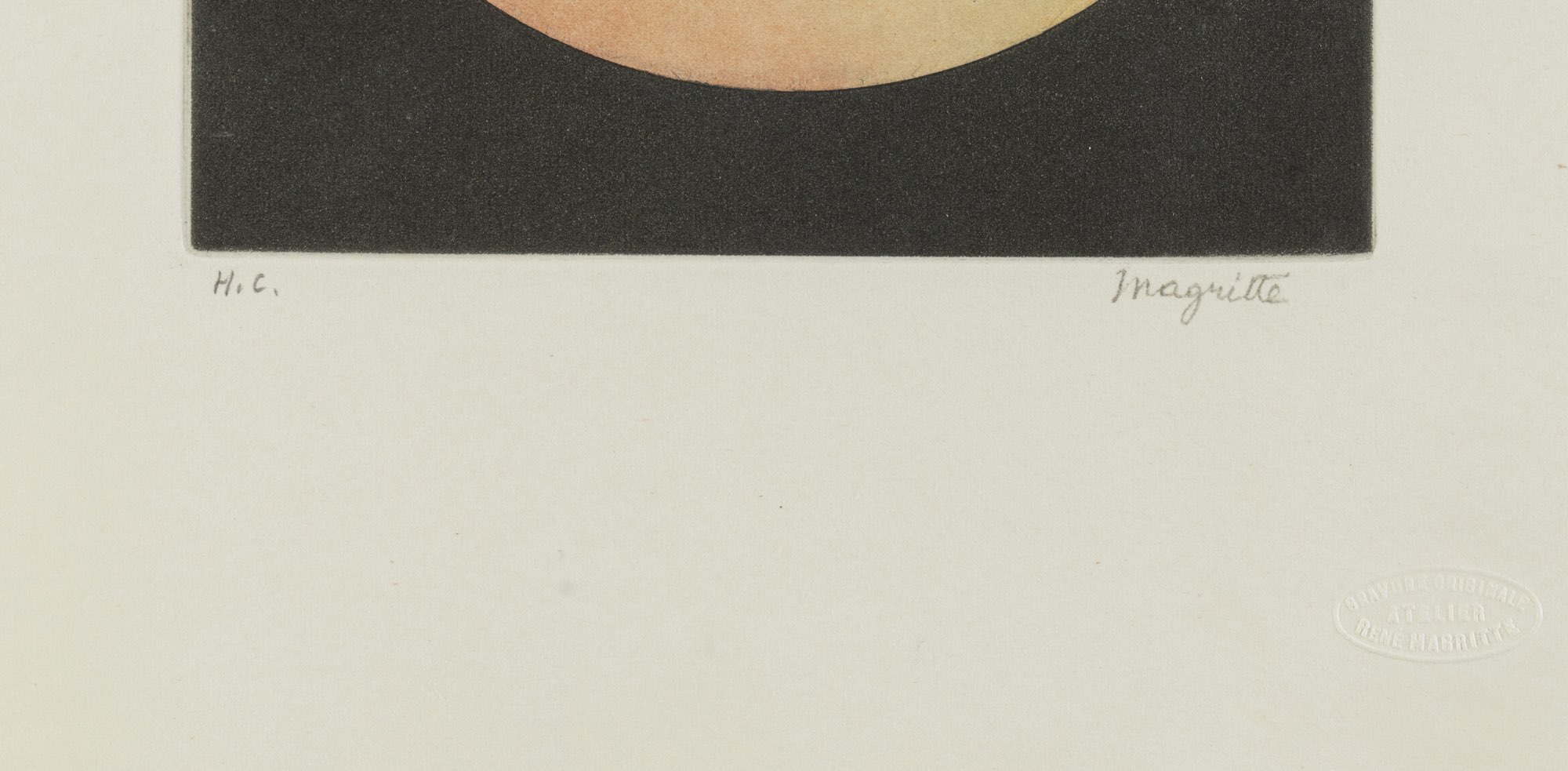 Acquaforte su carta japon, reca firma in basso a destra, numero di esemplare in basso a sinistra H.C., timbro a secco “Bravure originale Atelier Rene Magritte”, foglio H cm 28x23, lastra H cm 17,3x14,5 - Bibliografia di riferimento: The Graphic Work of Rene Magritte, a cura di Kaplan Gilbert E. e Timothy Baum, II Editions, Institutional Investor Inc. New York, 1982 N.17.