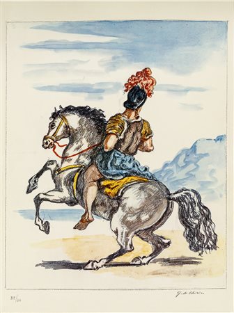 Opera firmata a matita in basso a destra e con numerazione 282/600 in basso a sinistra, H cm 55x40- cartella H cm 56,5x40,5x1. - Dalla cartella “Giorgio De Chirico con un saggio di Salvatore Quasimodo”, Alberto Marotta Editore, Napoli, 1968.