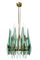 Lampada a sospensione con struttura in ottone lucidato e tegole in cristallo colorato curvato e molato, disposte verticalmente.