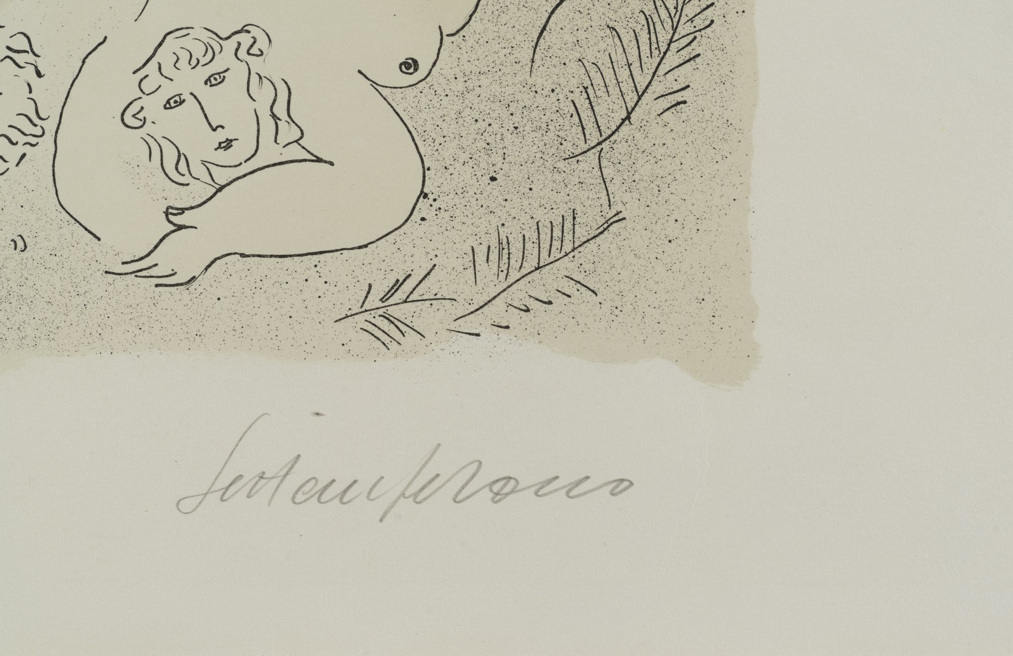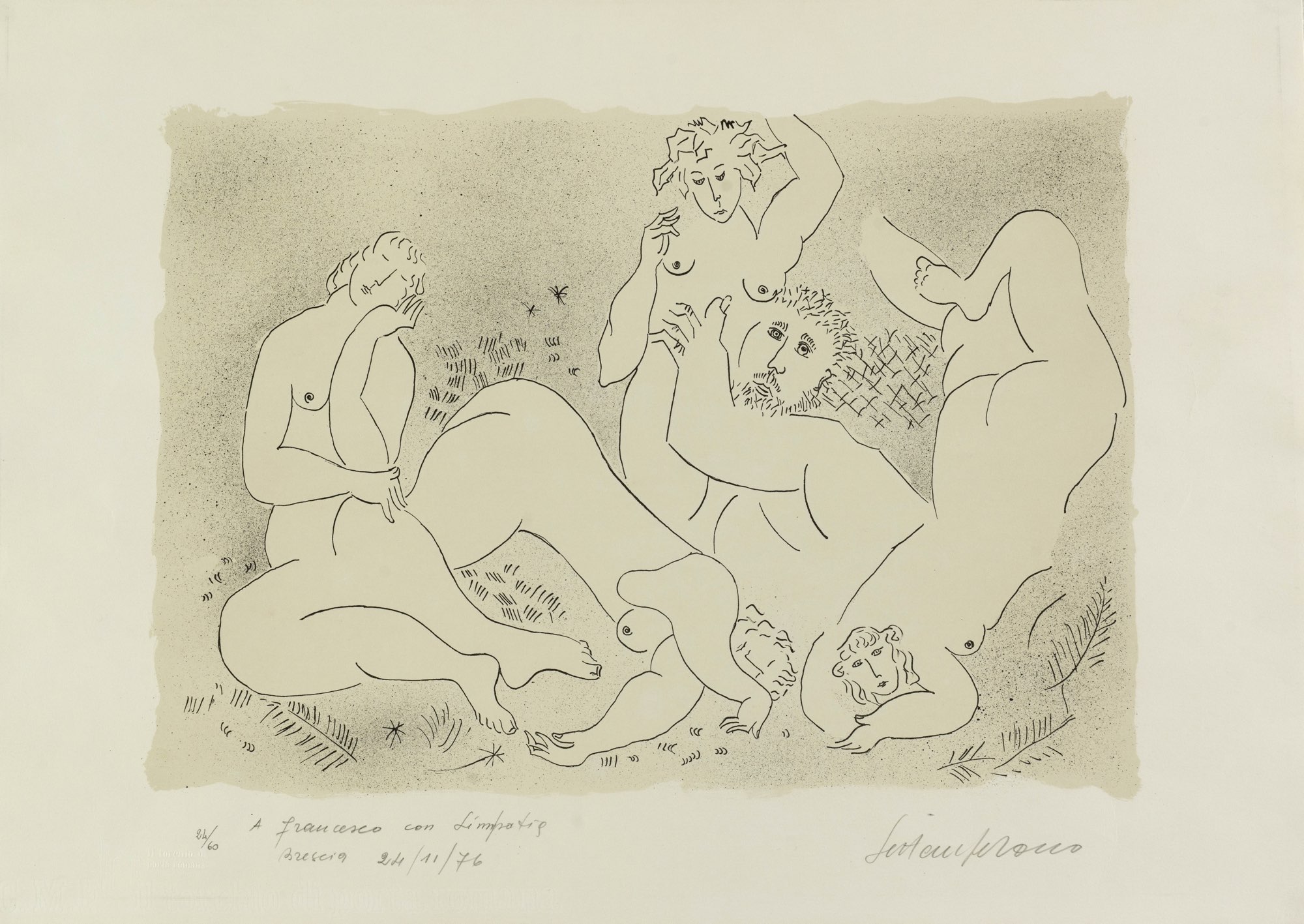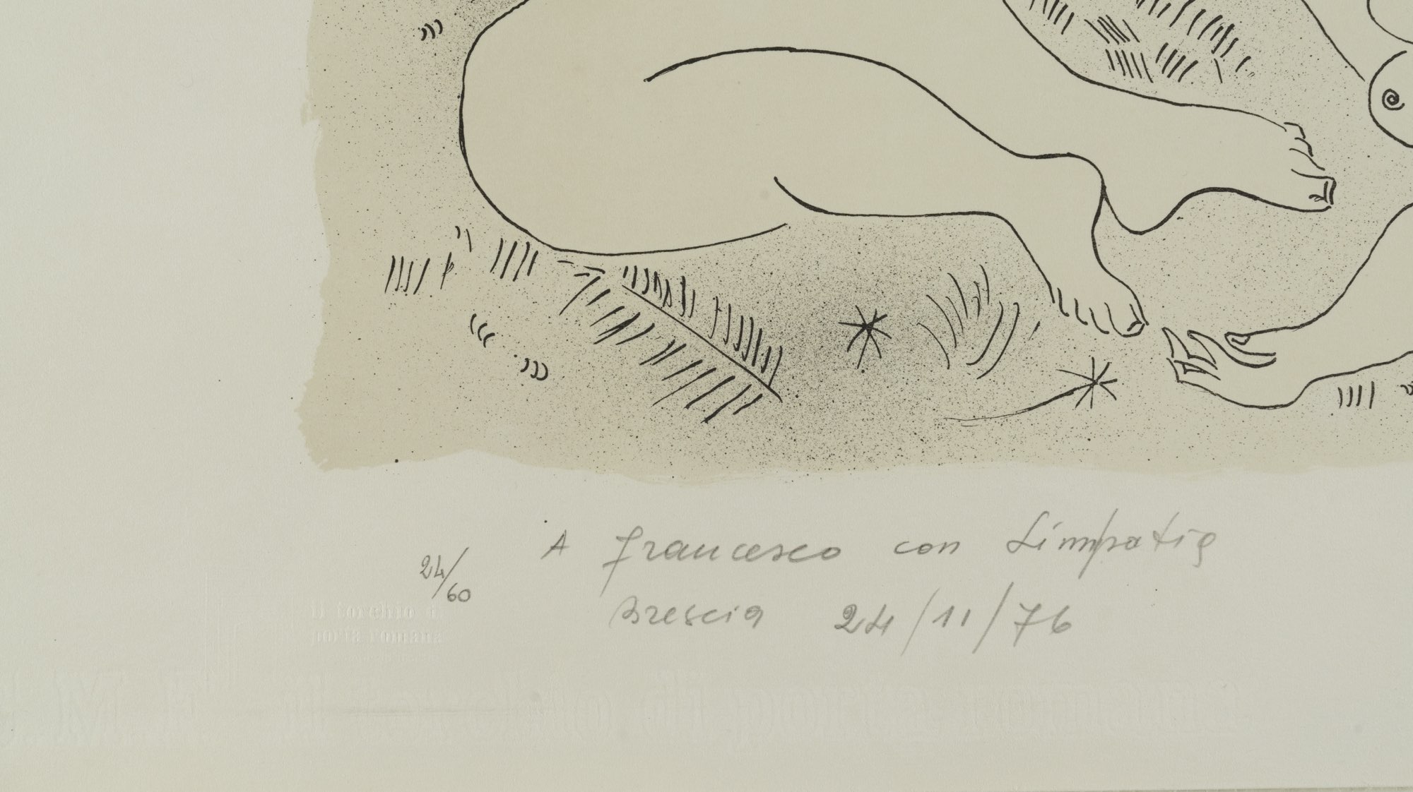 Litografia su carta, reca firma a matita in basso a destra, in basso a sinistra numerazione 24/60 e dedica “A Francesco con simpatia. Brescia 24/11/76” a matita, presenta timbro a secco della Stamperia d’arte “Il Torchio di Porta Romana”, foglio H cm 37x50