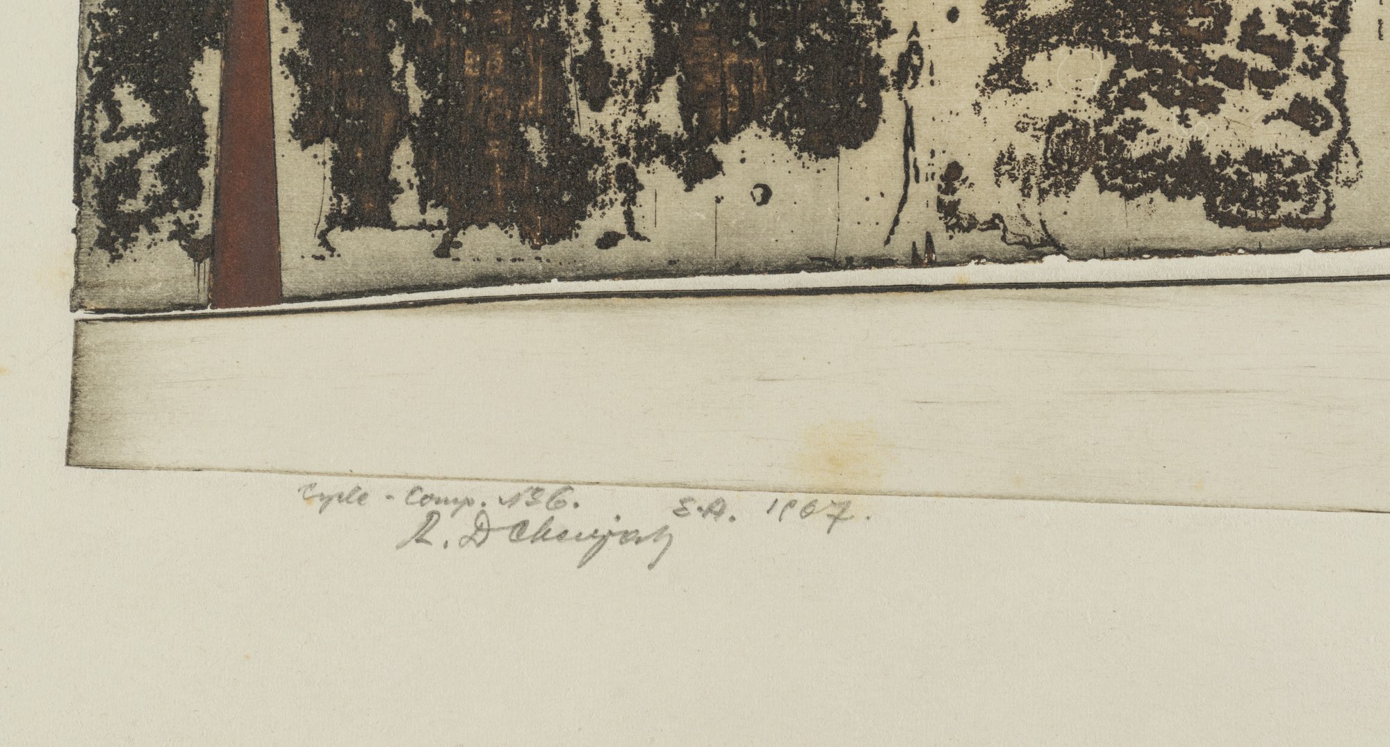 Incisione acquatinta su carta, presenta in basso a matita firma, datazione ed. ese,plare “E. A.”, reca timbro a secco “Anches”, lastra H cm 50x23 – foglio H cm 66x50 (difetti)