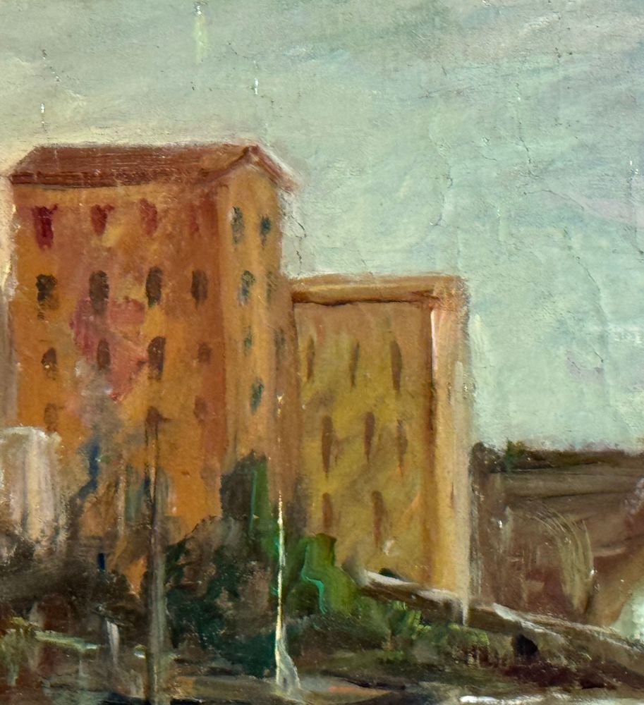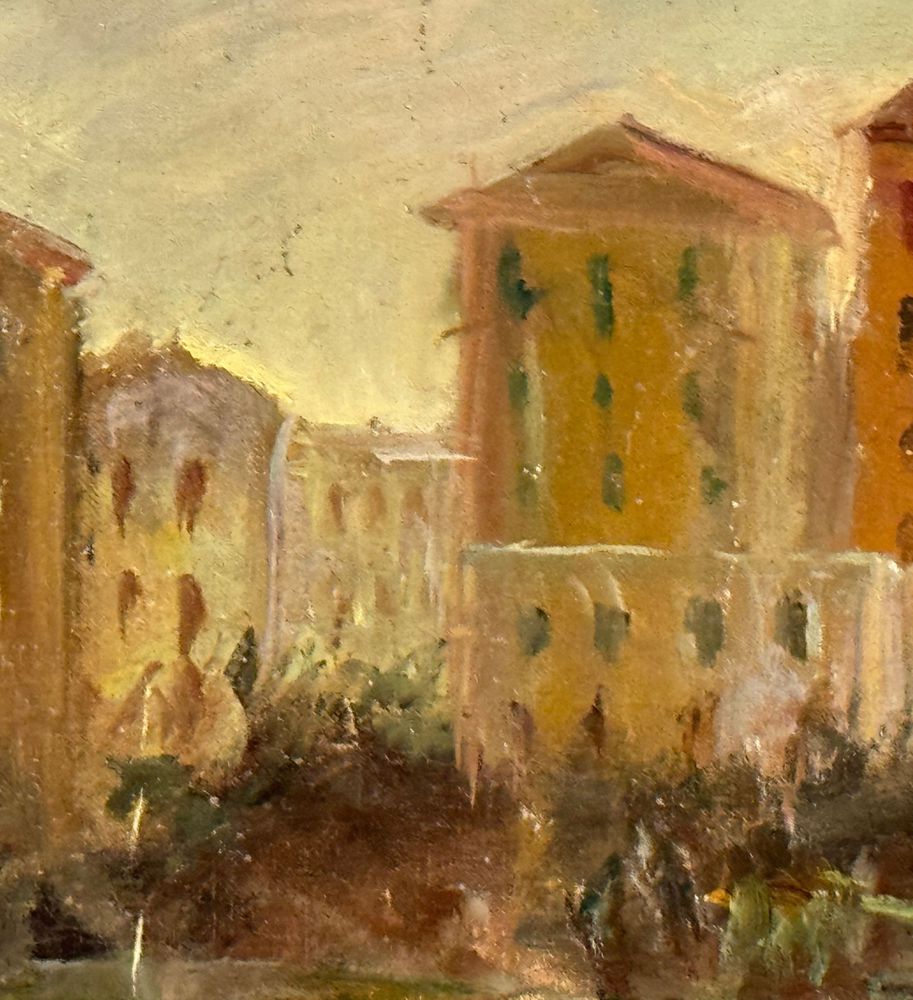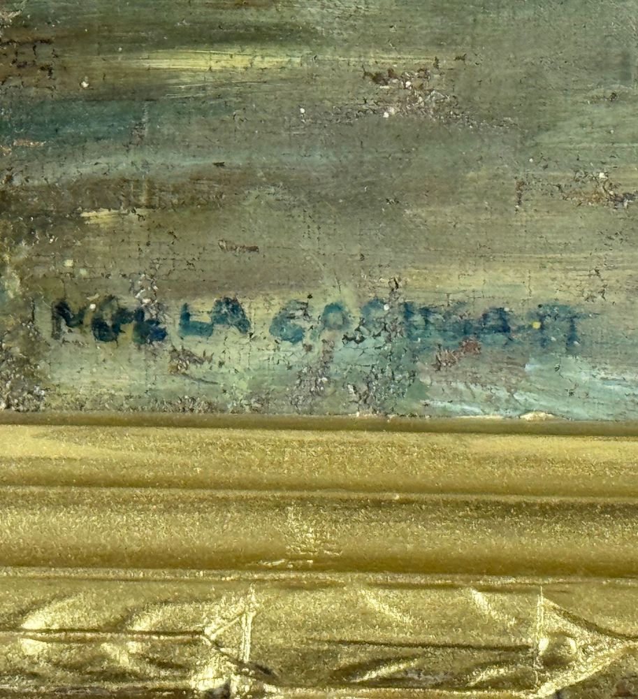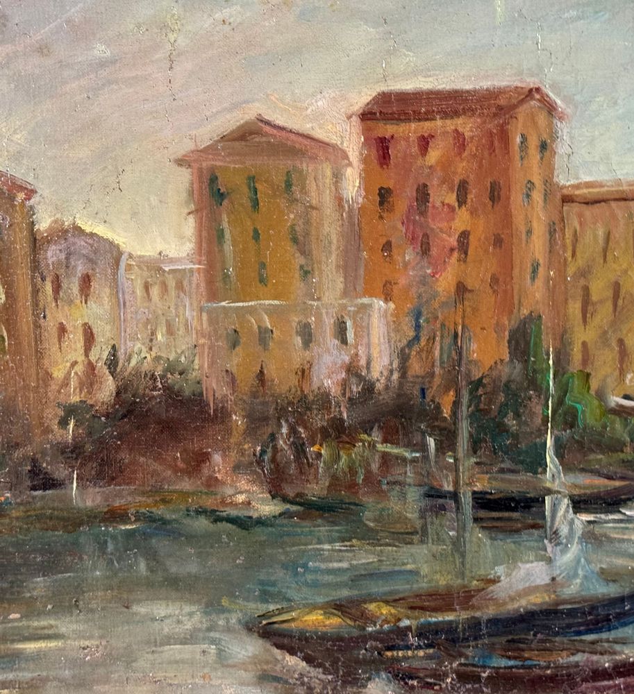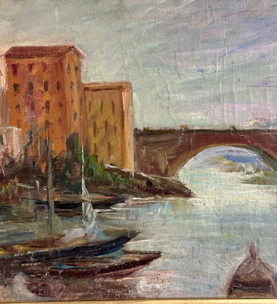 Dipinto olio su tela applicata su pannello, periodo XX secolo scuola Italiana, raffigurante Scorcio di fiume con barche. Dimensioni compreso cornice: 67x47 cm. Dimensioni interno cornice: 55x35 cm. Reca firma in basso a sinistra da Angela Carugati. Opera in buone condizioni.