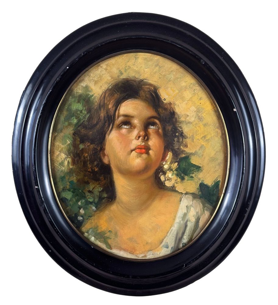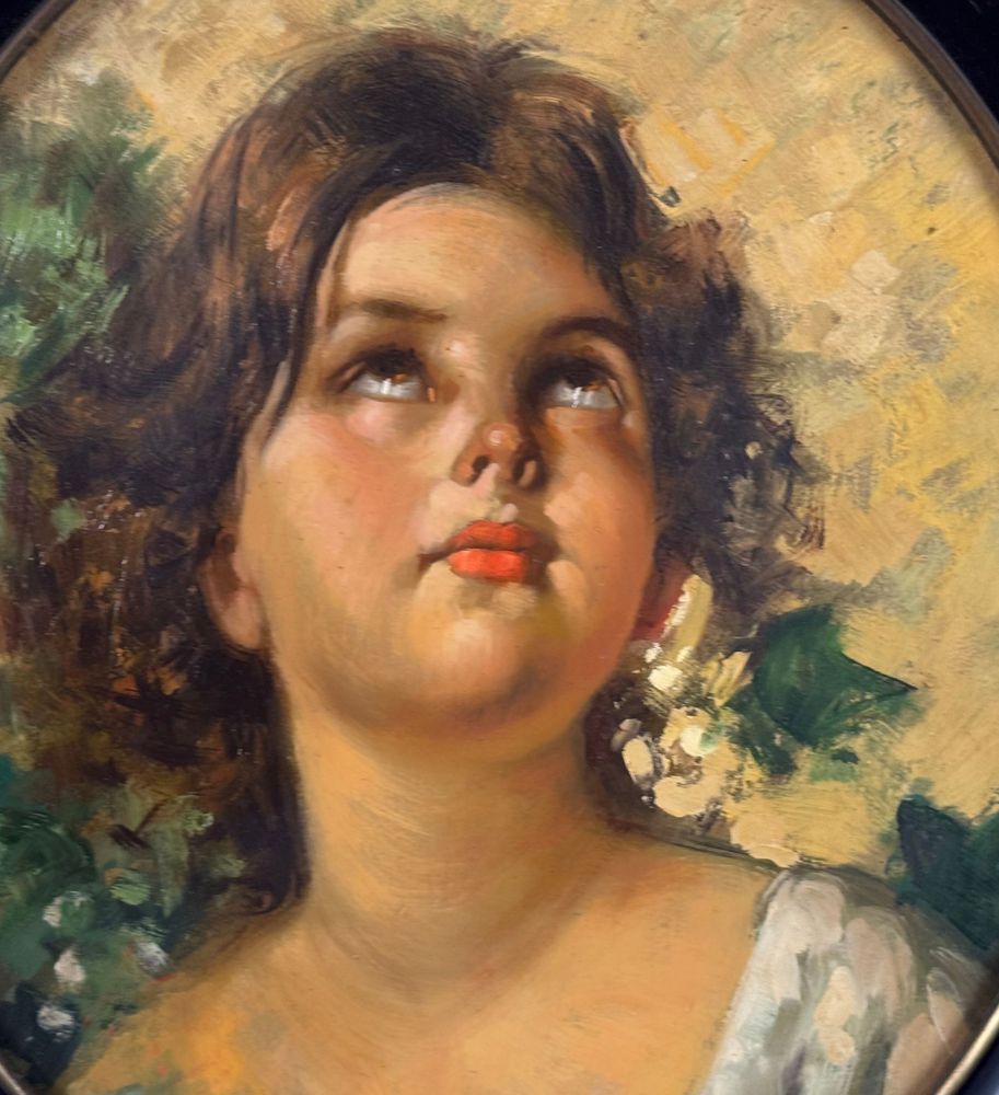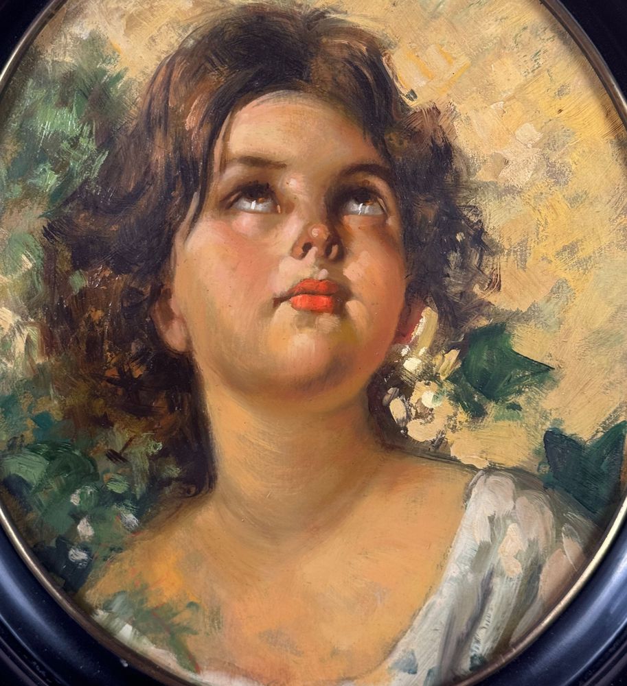 Dipinto olio su tavola, opera di forma ovale periodo XX secolo scuola Italiana, raffigurante Ritratto di bambina. Omaggio a Vincenzo Irolli. Dimensioni compreso cornice: 43x38 cm. Dimensioni interno cornice: 34x29 cm. Da artista anonimo. Opera in buone condizioni.