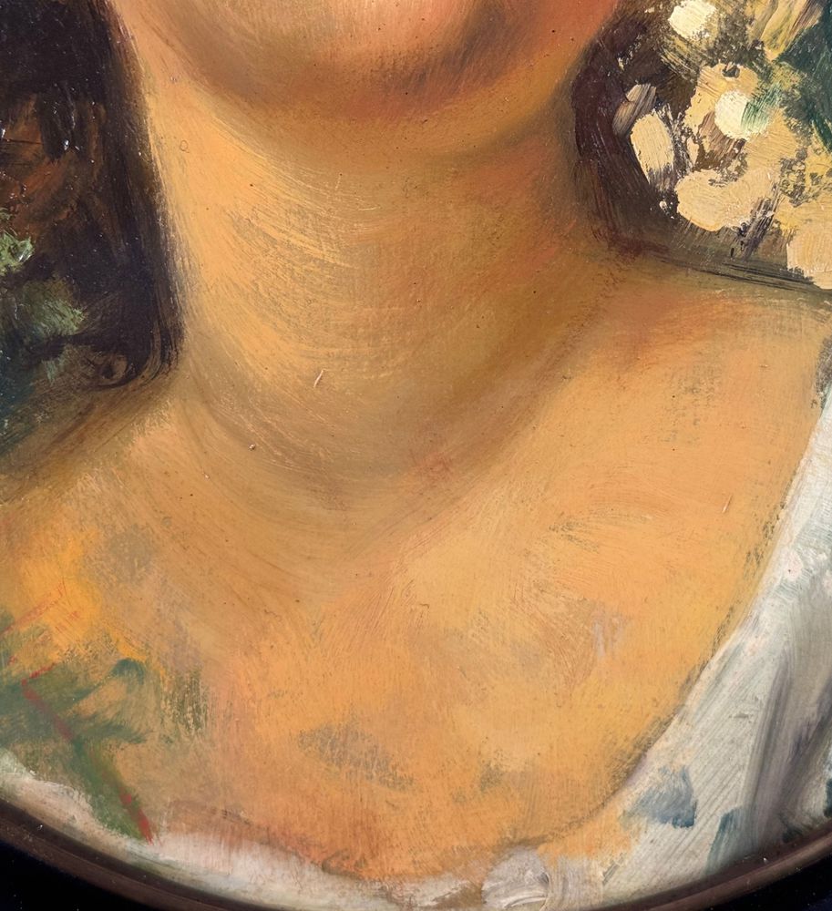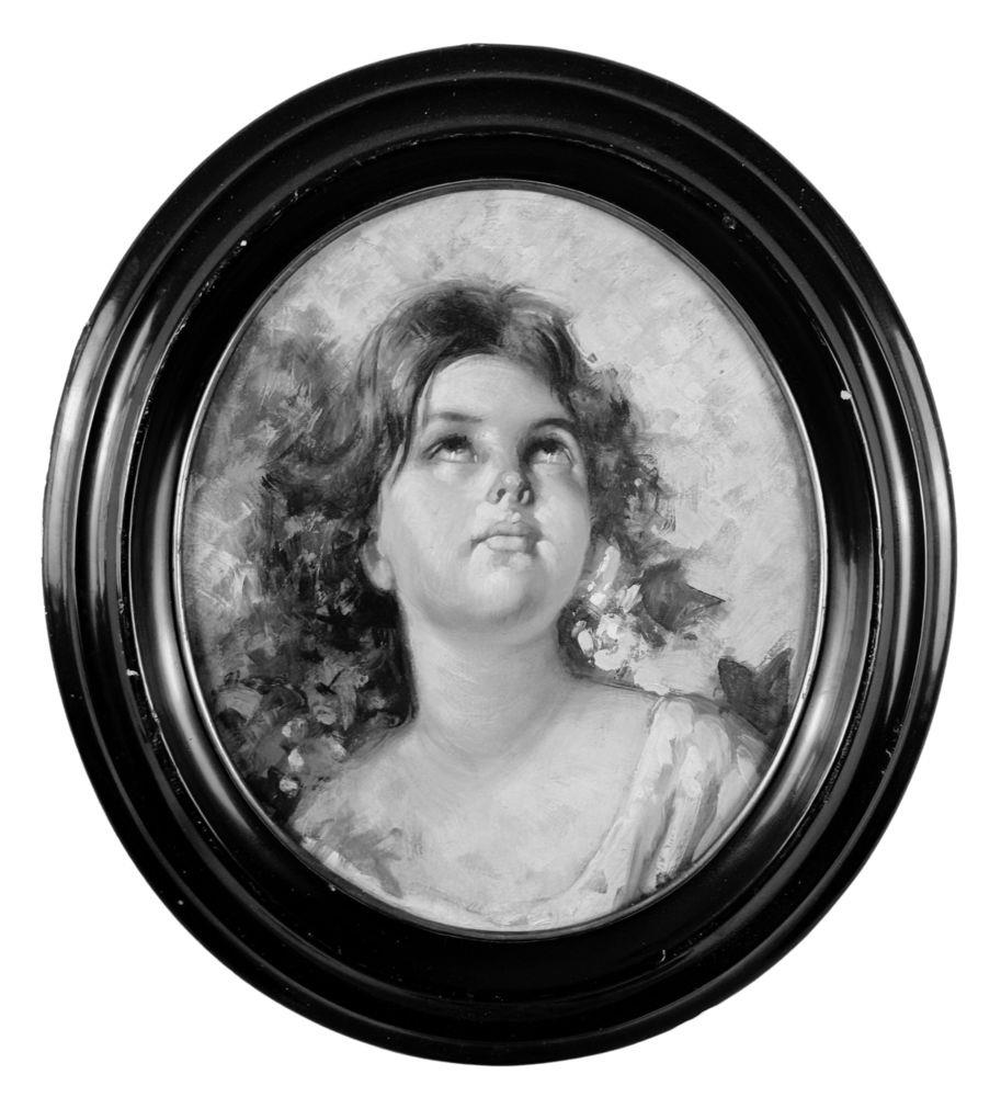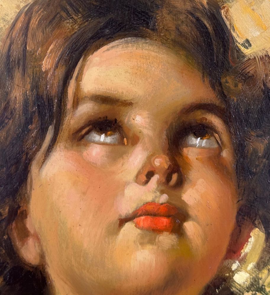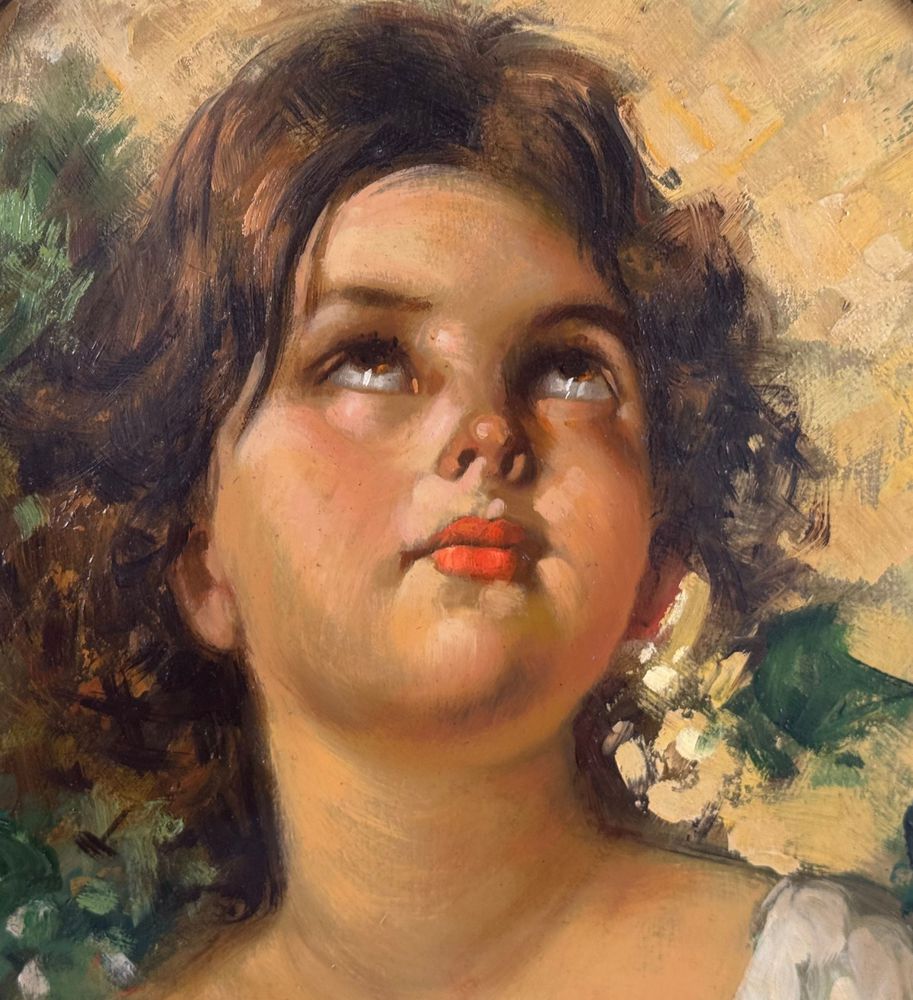 Dipinto olio su tavola, opera di forma ovale periodo XX secolo scuola Italiana, raffigurante Ritratto di bambina. Omaggio a Vincenzo Irolli. Dimensioni compreso cornice: 43x38 cm. Dimensioni interno cornice: 34x29 cm. Da artista anonimo. Opera in buone condizioni.