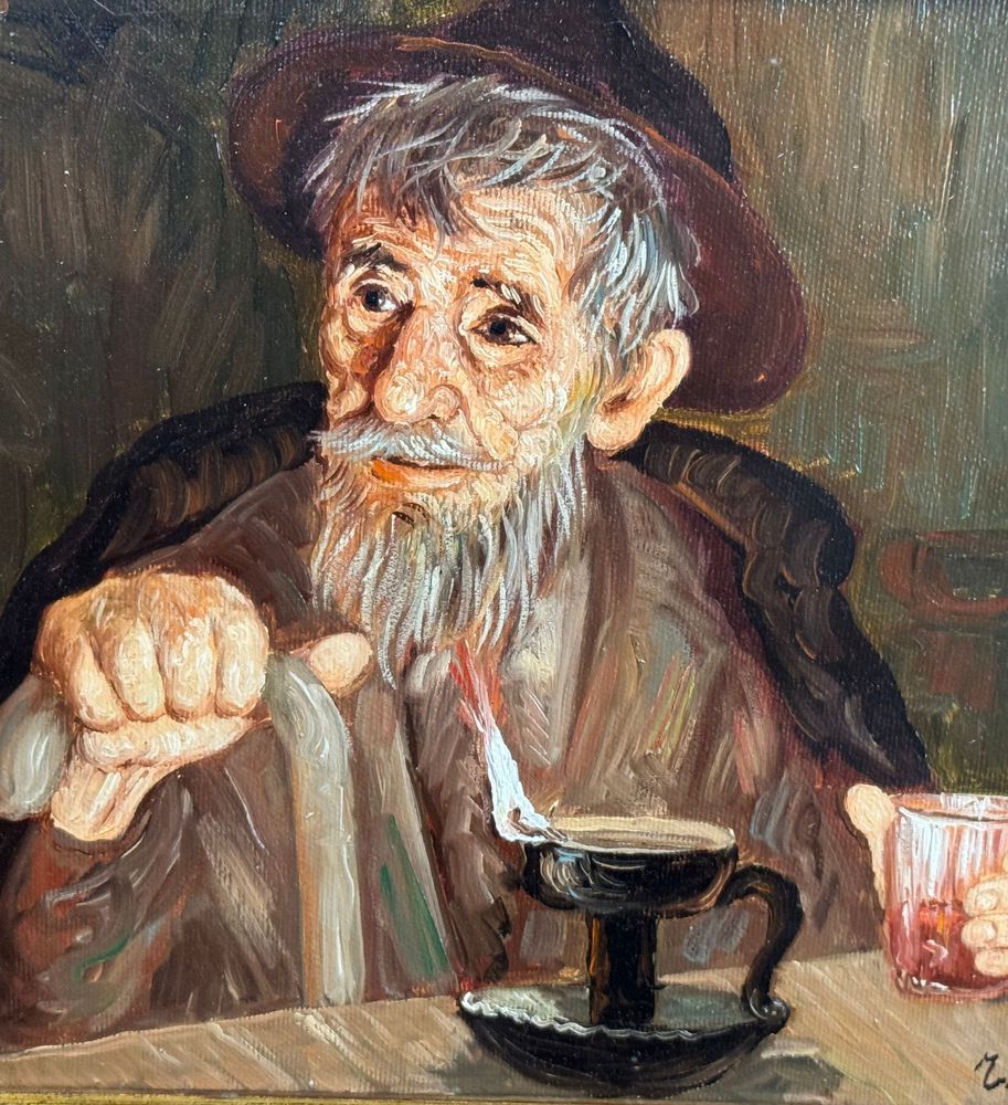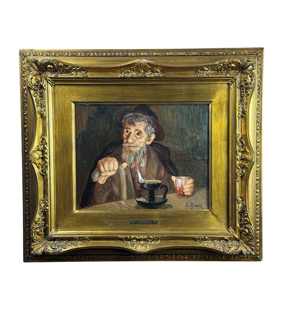 Dipinto olio su tela, periodo XX secolo scuola Italiana, raffigurante Ritratto di anziano. Dimensioni interno cornice: 24x30 cm. Reca firma in basso a destra da Tulio Grassi (1946). Opera in buone condizioni.