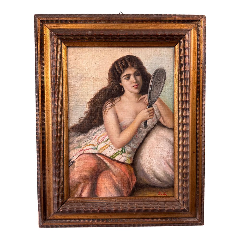 Dipinto olio su tela applicata su cartoncino, periodo XX secolo, scuola Italiana, raffigurante Ritratto di donna mentre si specchia
