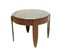 Tavolo in legno con piano in vetro trasparente e specchiato.