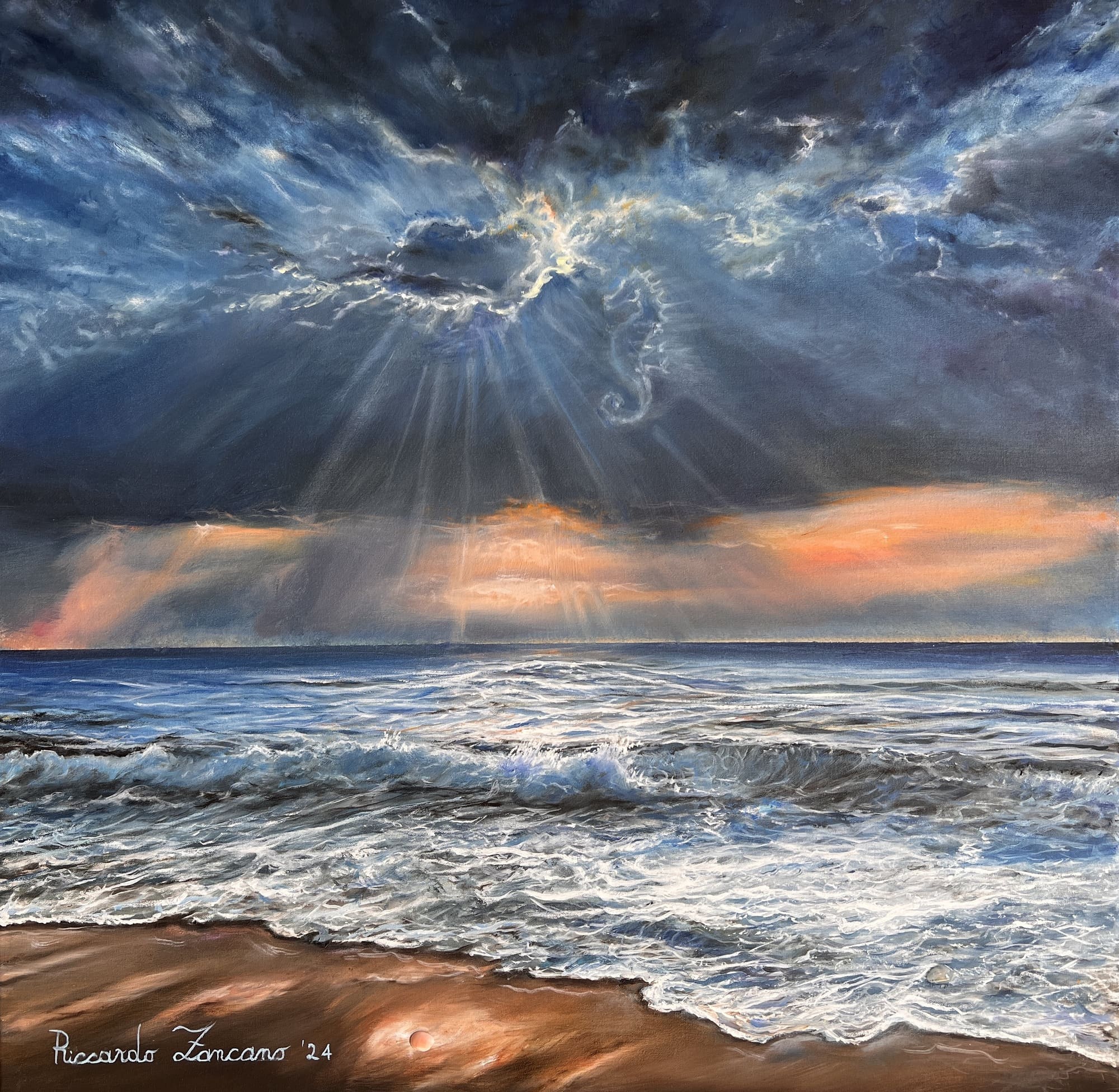Tecnica: olio, corallo rosa, pietra di luna e acquamarina
