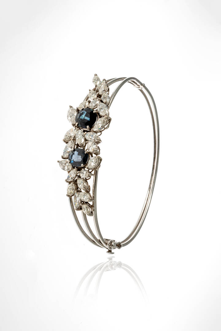rigido, in oro bianco, anni '70, con due zaffiri taglio ovale per totali ct 2,90 ca e diamanti taglio navette a decoro per totali ct 3,50 ca, probabile colore G-H, purezza VS