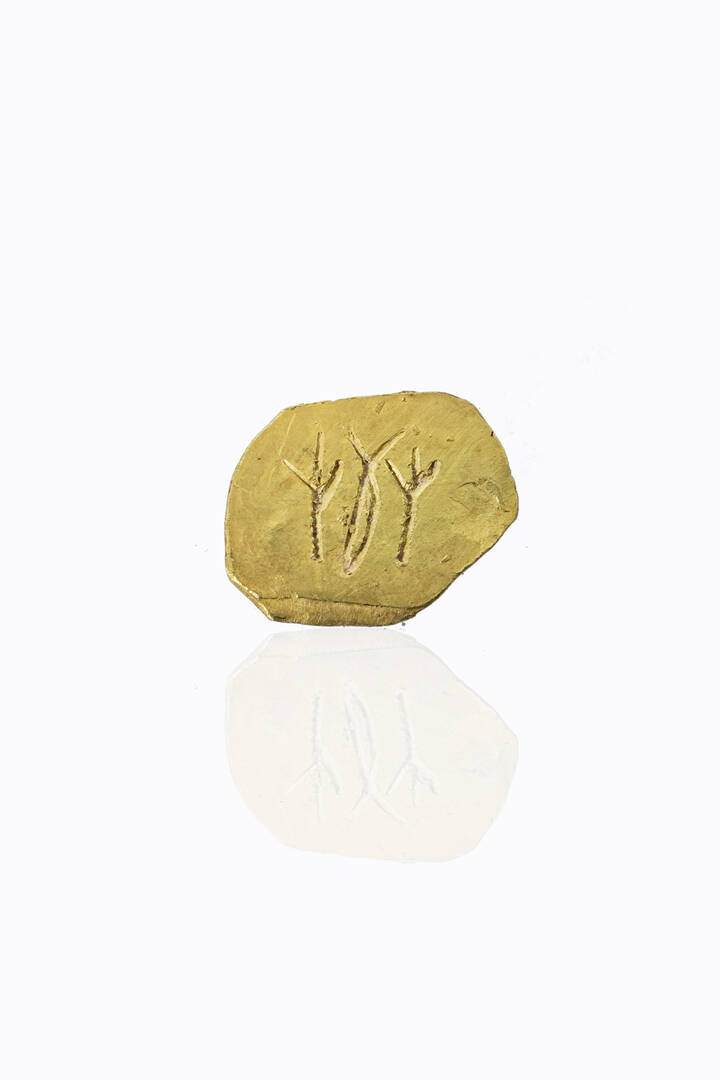 Lastra in oro giallo lucido e satinato, firmata "Licata", incisa sul fronte con motivi astratti.