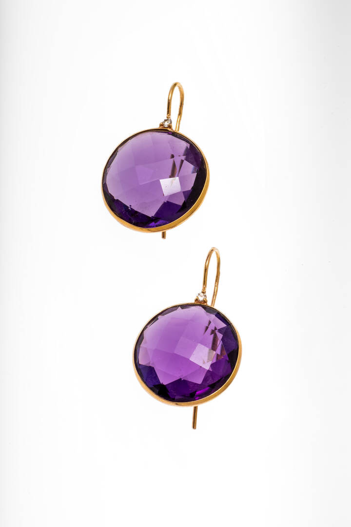 in oro giallo, ad amo, con ametiste taglio briolette. Sormontate da due diamanti taglio brillante per totali ct 0,05 ca