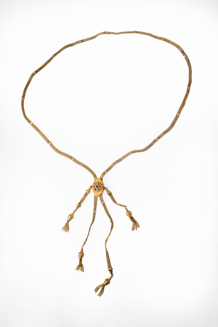 in oro 9 Kt, XIX secolo, con frange pendenti e centrale ovale con perline e gemma verde sintetica