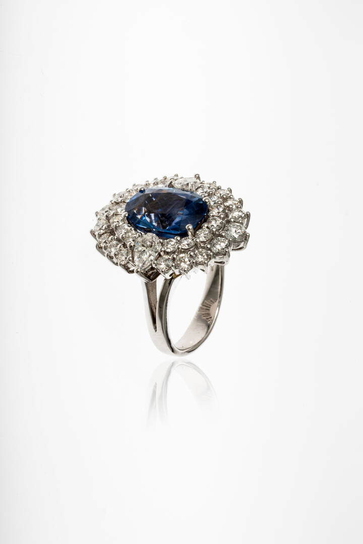 in oro bianco, al centro zaffiro Ceylon (Sri Lanka) taglio ovale di ct 5,28 senza indicazione di riscaldamento (no heat), contornato da diamanti taglio brillante per totali ct 2,60 ca, probabile colore G-H, purezza IF-VVS.