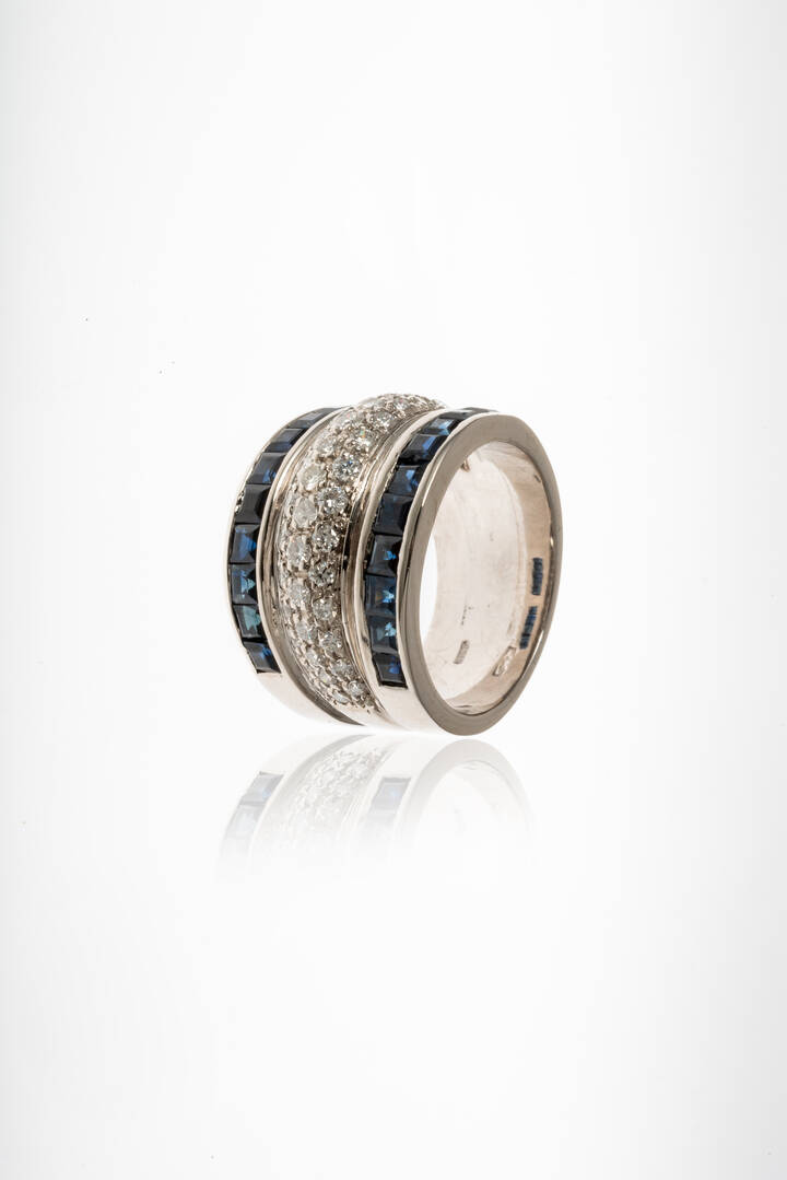 in oro bianco, a fascia, con fila centrale di diamanti taglio brillante per totali ct 0,50 ca e due file di zaffiri per totali ct 2,50 ca