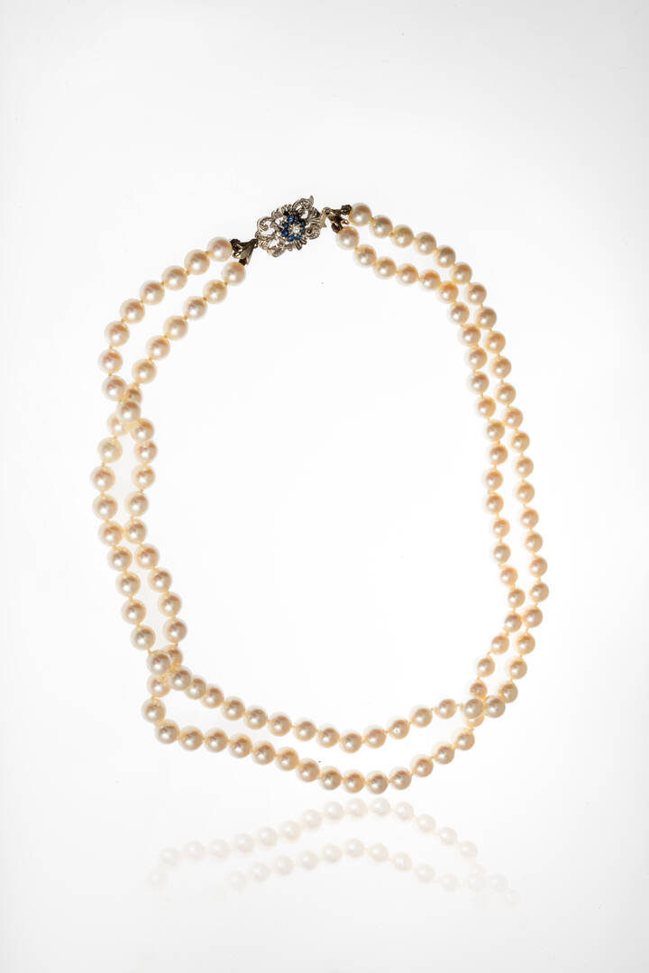 composto da due fili di perle giapponesi del diam. di mm 7-7,5. Chiusura in oro bianco con piccoli zaffiri