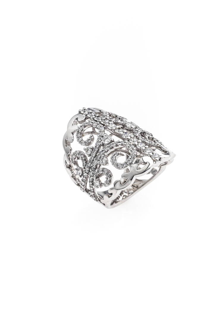 in oro bianco, sommità a fascia, con arabeschi in diamanti taglio brillante per totali ct 2,15 ca, probabile colore G-H, purezza IF-VVS