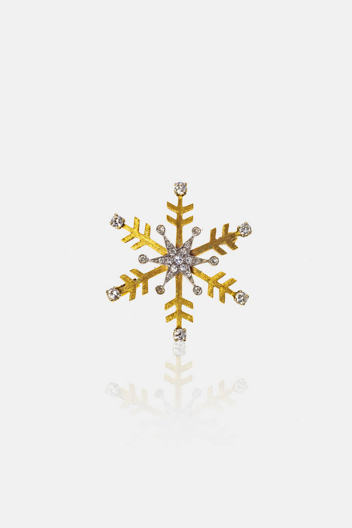 in oro giallo e bianco, a forma di fiocco di neve, con diamanti taglio 8/8 e brillante per totali ct 0,40 ca