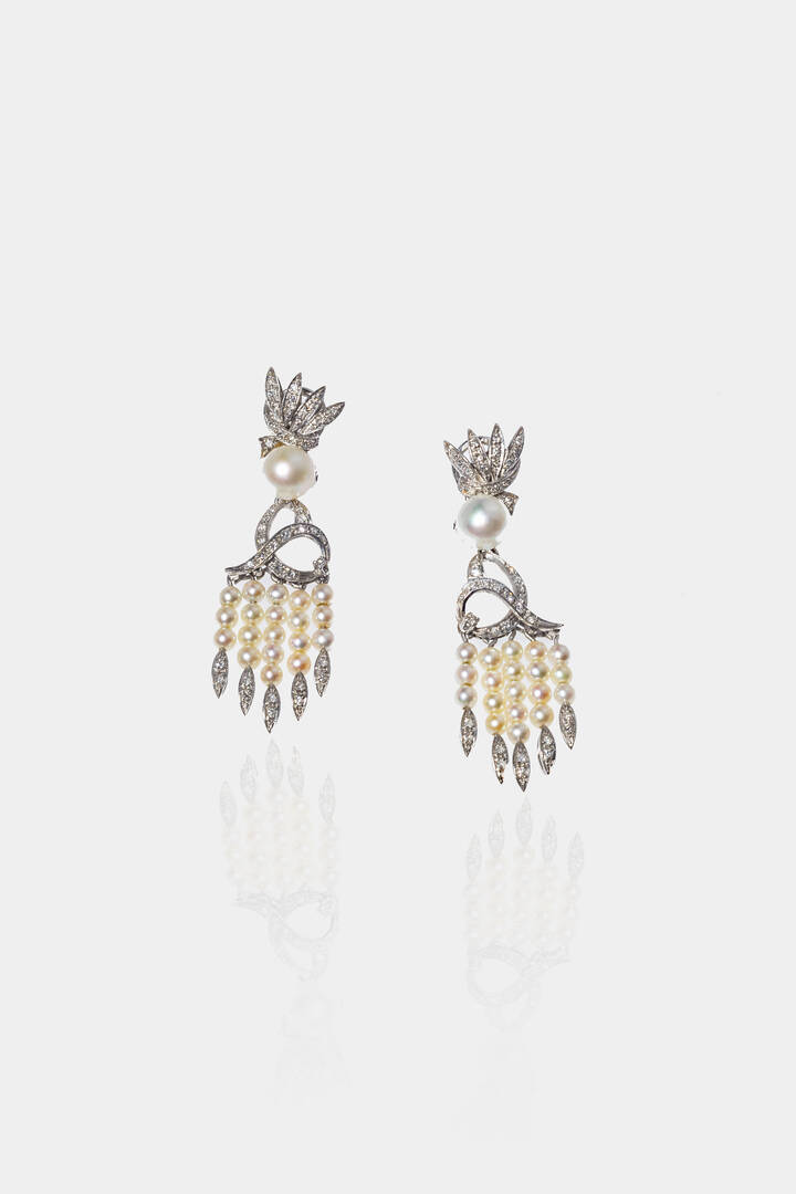 in oro bianco, anni '50, con due perle giapponesi ai lobi del diam di mm 8,2 ca; volute in diamanti taglio 8/8 per totali ct 0,85 ca, terminanti con frange in perle giapponesi del diam di mm 3,5 ca.