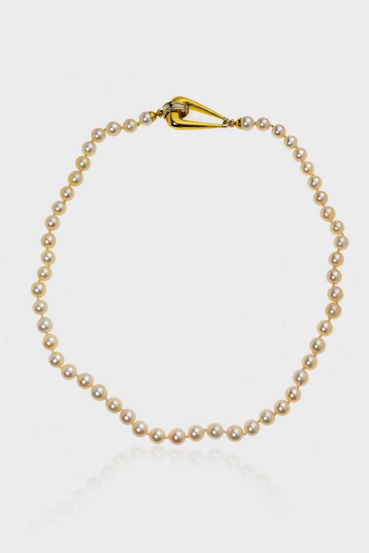 composto da un filo di perle giapponesi del diam. di mm 7,5-8. Chiusura in oro giallo e bianco di forma geometrica.