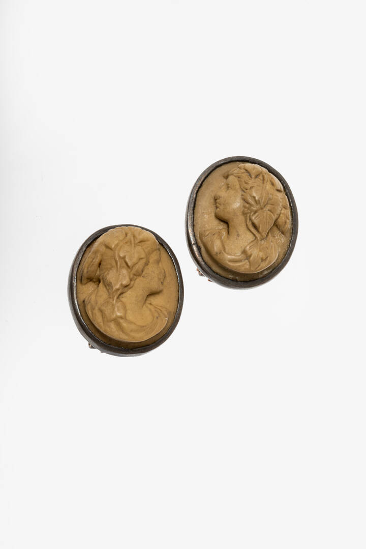 in oro a bassa caratura e argento, a clip, con pietre laviche incise con ritratti femminile.