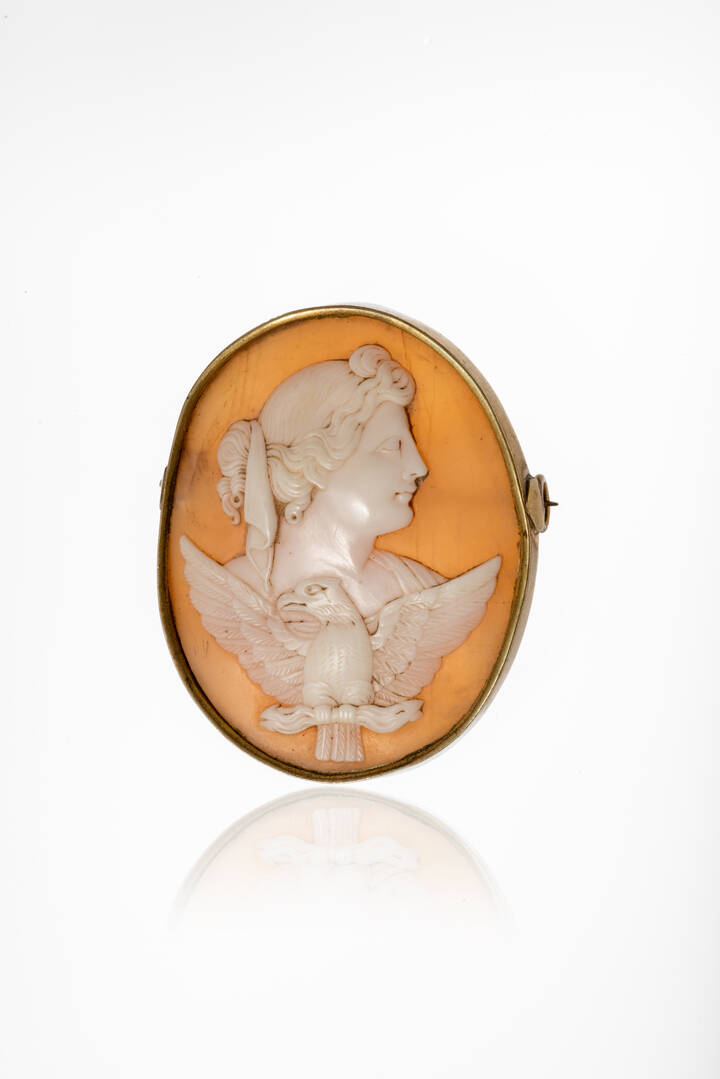 con grande cammeo raffigurante donna di profilo e al centro un'aquila. Montatura in metallo dorato. XIX secolo.