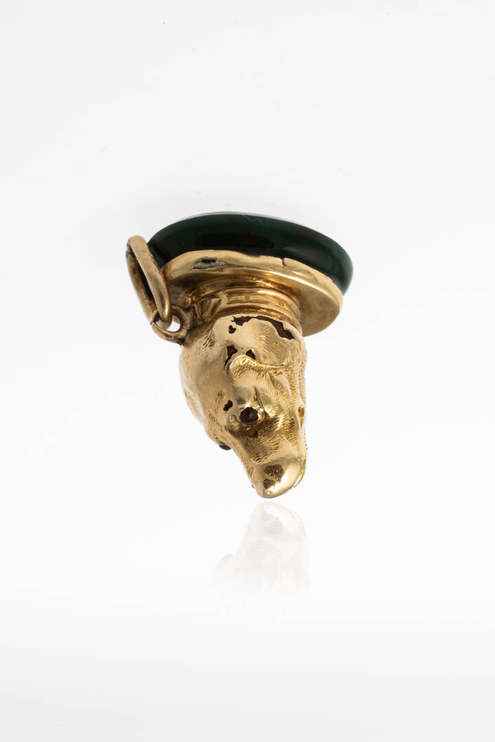 in oro giallo a forma di testa di cane con sigillo in diaspro verde con incise le lettere "D.G".