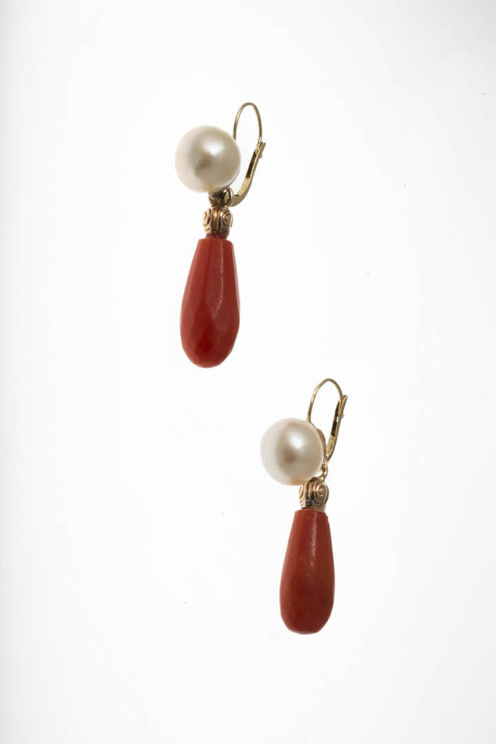in oro giallo, a monachella, con due perle giapponesi del diam. di mm 8,5 ca, terminanti con due gocce intercambiabili di corallo mediterraneo color salmone.