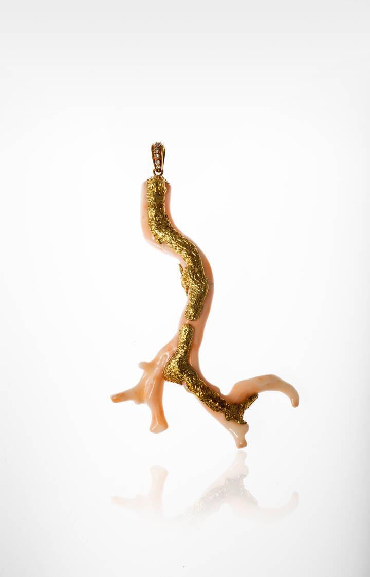 Ramo di corallo rosa con biliere in oro giallo e decori in oro giallo lungo il ramo. Diamanti taglio brillante per totali ct 0,08 ca