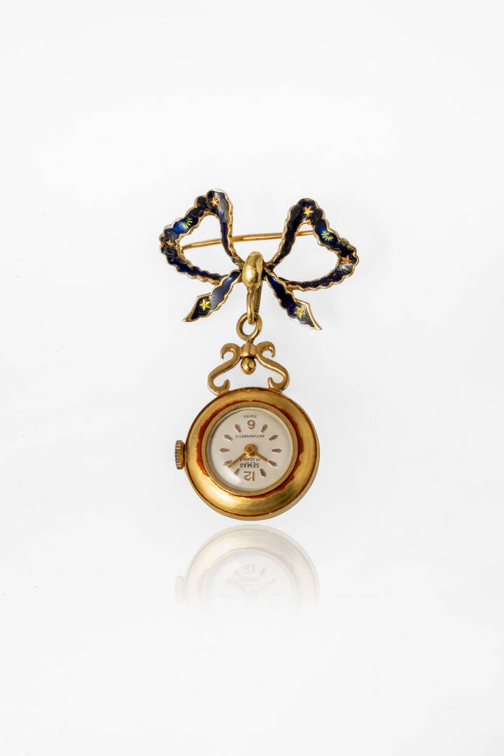 in oro giallo con fiocco in smalto blu e terminante con orologio (non funzionante). Difetti allo smalto e mancanze.
