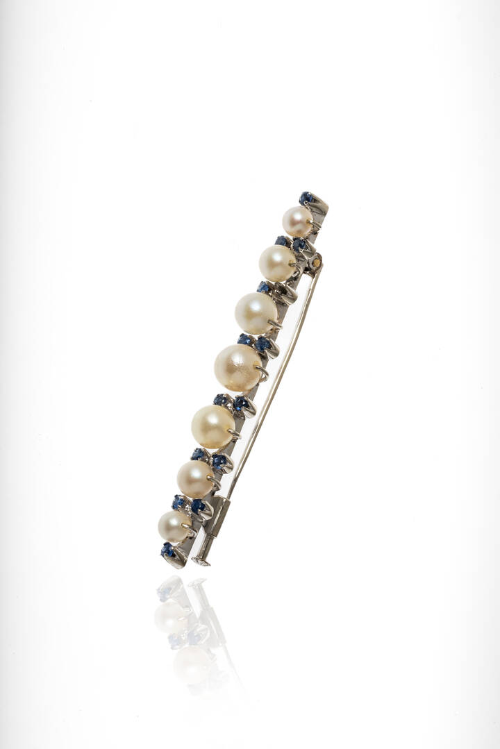 in oro bianco, a barretta, anni '50 con sette perle giapponesi a scalare dal diam. di mm 4 a 6,5 ca, alternati a zaffiri taglio rotondo per totali ct 0,45 ca (uno mancante)