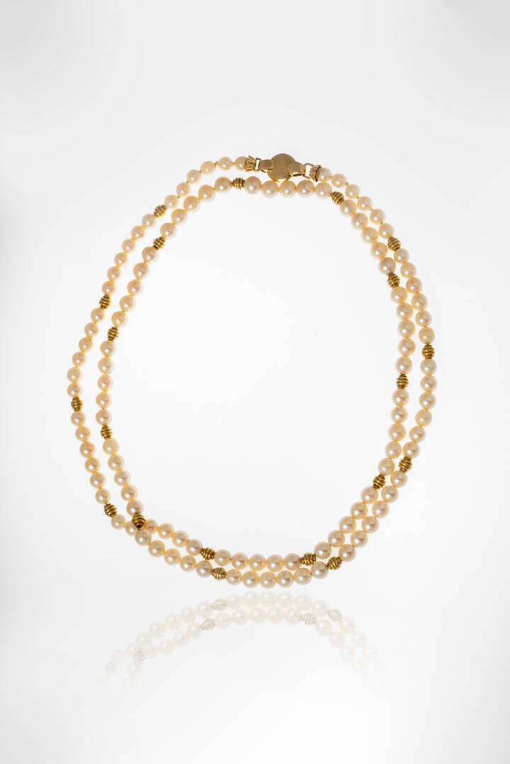 composta da un filo di perle giapponesi (difetti) del diam di mm. 6 ca. Chiusura e distanziali in oro giallo