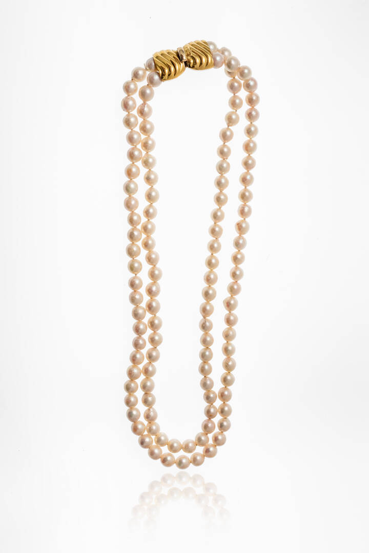 composto da due fili di perle giapponesi del diam di mm 7-7,5 ca. Chiusura in oro giallo, a fiocco.