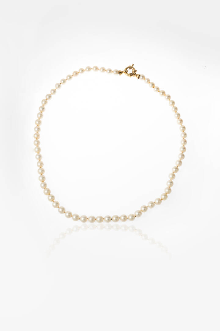 composto da un filo di perle giapponesi del diam. di mm 6,5-7 ca. Chiusura ad anello in oro giallo.
