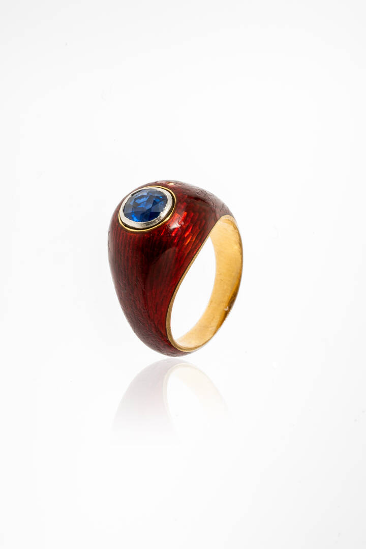 in oro giallo, sommità bombata in smalto rosso (difetti) ed al centro zaffiro taglio rotondo di ct 0,80 ca.