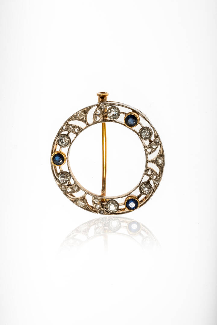 in oro giallo e platino, anni '20, di forma rotonda con diamanti taglio brillante di vecchio taglio per totali ct 0,80 ca e tre zaffiri tagli rotondo per totali ct 0,50 ca