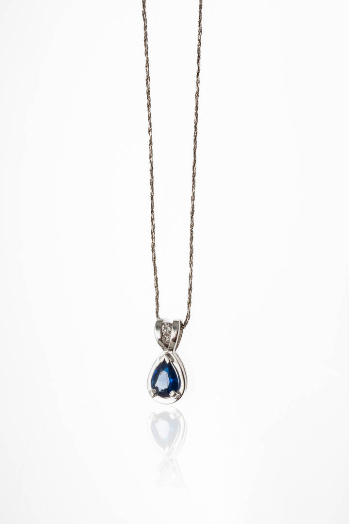 in oro bianco con zaffiro taglio a goccia di ct 0,80 ca e diamanti taglio brillante per totali ct 0,08 ca, probabile colore G-H, purezza IF-VVS