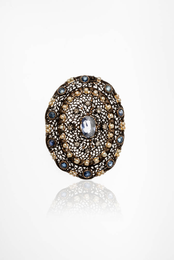 in oro giallo a bassa caratura e argento, di forma ovale, con zaffiri taglio rotondo per totali ct 4 ca, rosette di diamanti per totali ct 0,20 ca e piccole perline naturali a decoro (una perlina mancante).