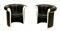 Coppia di poltroncine a pozzetto in legno laccato bianco e seduta in pelle nera.