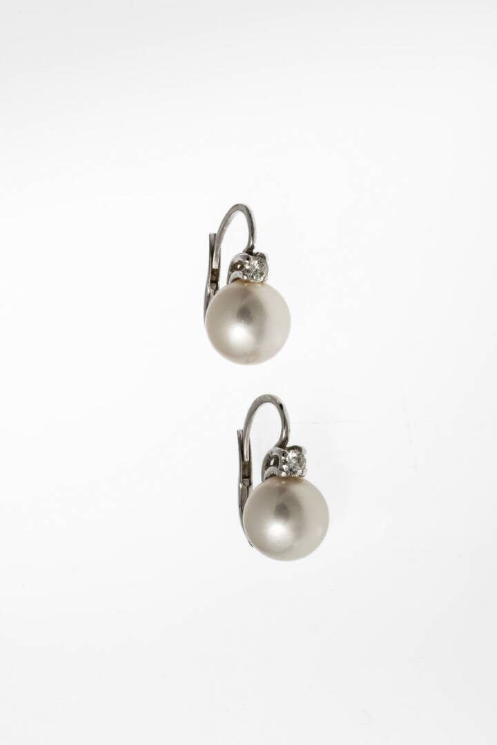 in oro bianco, a monachella con due perle giapponesi del diam. di mm 9,5 ca, sormontate da due diamanti taglio brillante per totali ct 0,10 ca