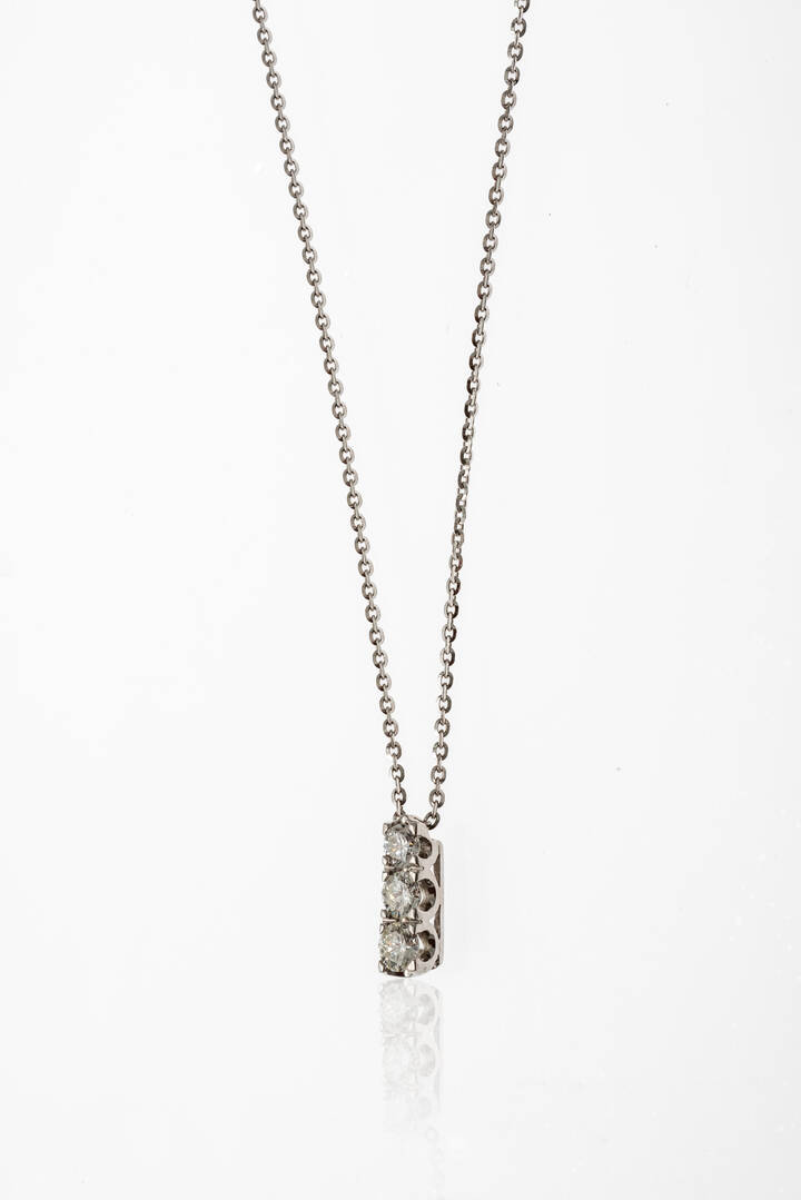 in oro bianco con tre diamanti taglio brillante per totali ct 0,48 ca, probabile colore G-H, purezza IF-VVS