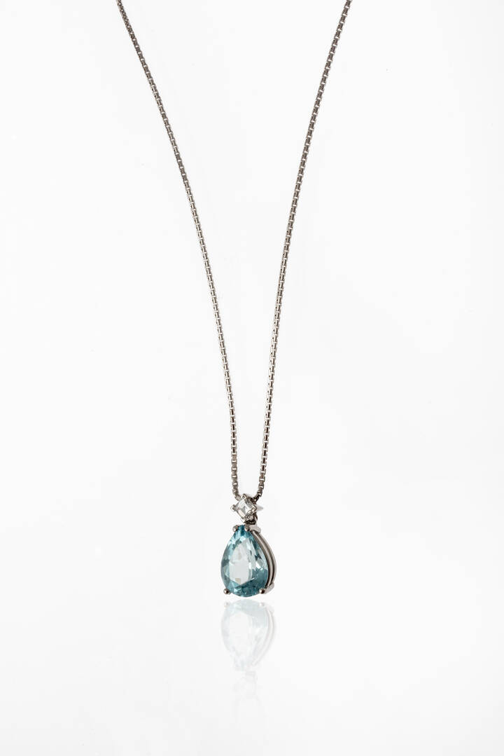 in oro bianco, con acquamarina taglio a goccia di ct 2,80, sormontata da diamante taglio carré di ct 0,20 ca, probabile colore G-H, purezza IF-VVS