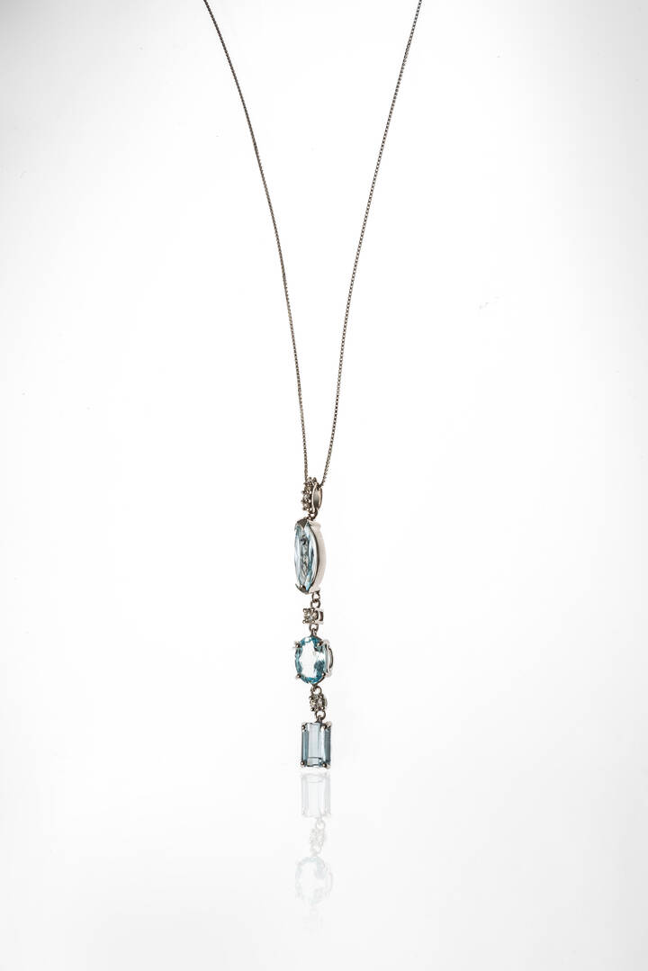 in oro bianco con tre acquamarine taglio navette, ovale e rettangolare ad angoli tronchi pendenti per totali ct 3,80 ca e diamanti taglio brillante per totali ct 0,15 ca, probabile colore G-H, purezza IF-VVS
