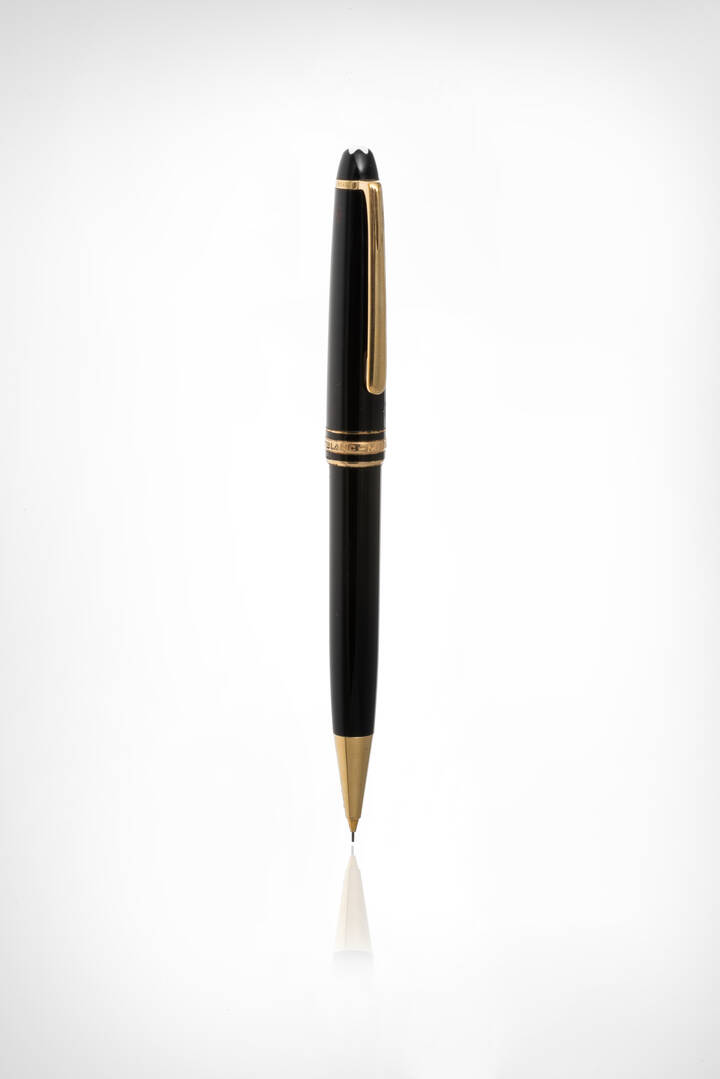Mina marcata "Montblanc", serie. "Meisterstuck". Cappuccio e corpo in resina nera con iconico logo della maison. Rifiniture placcate in oro giallo