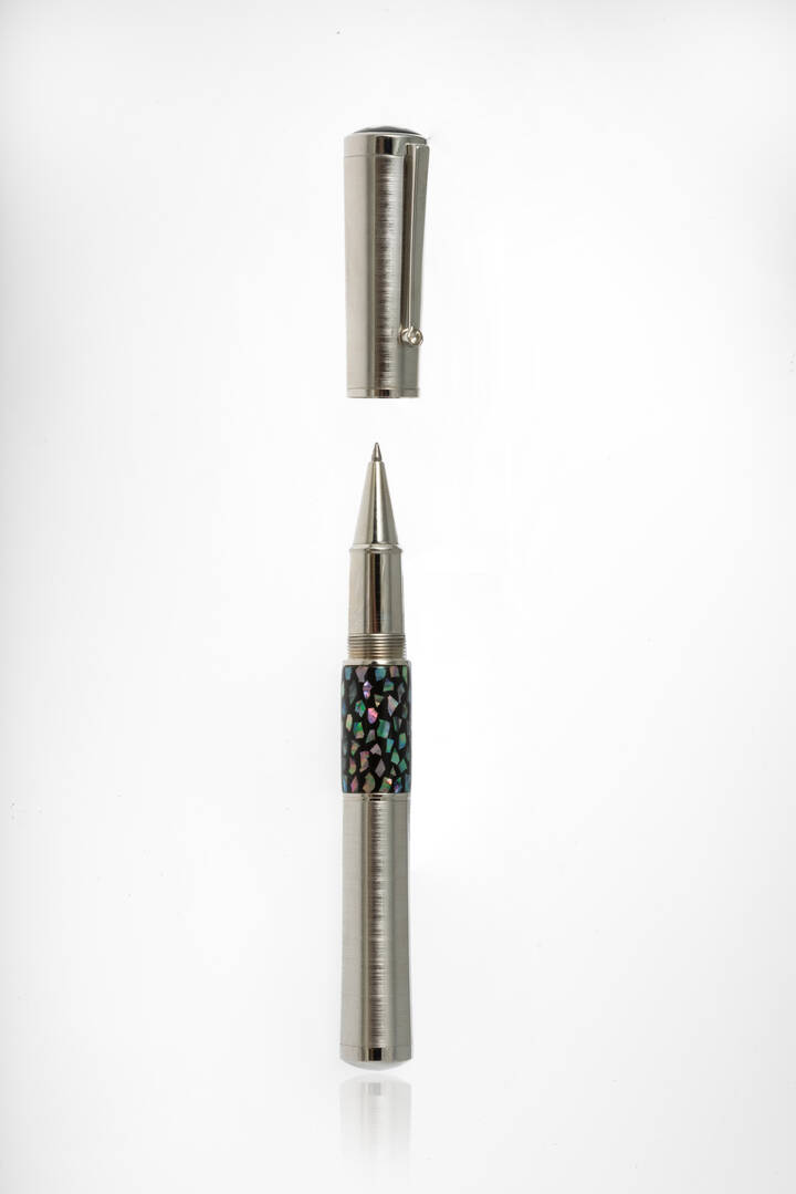Stilografica, marcata "Montblanc", edizione limitata "Mahatma Gandhi". Cappuccio e corpo in acciaio, con inserto in simil madreperla. Decori placcati in platino. Pennino in oro bianco 14 Kt.