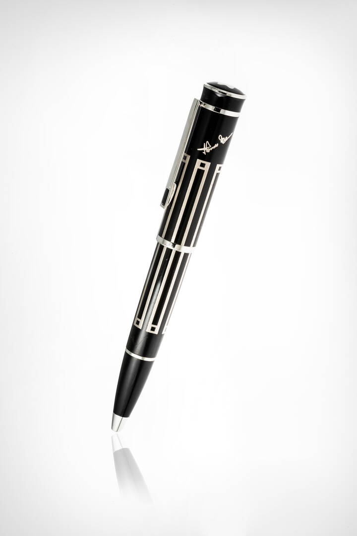 Penna a sfera, marcata "Montblanc", serie limitata "Writers Edition", es. 886/6000, dedicata a "Thomas Mann". Cappuccio e corpo in resina nera con iconico logo della maison e intarsi geometrici. Rifiniture placcate platino.