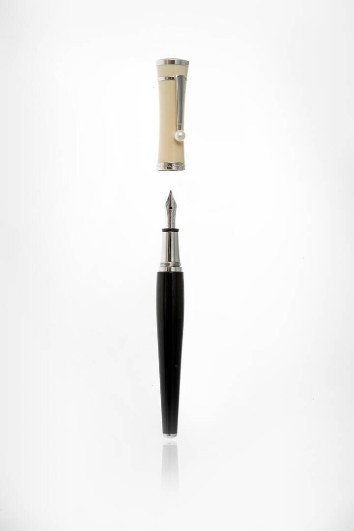Stilografica, marcata "Montblanc", serie limitata dedicata a "Greta Garbo". Cappuccio in resina bianca con iconico logo della maison e corpo in resina nera e intarsi geometrici. Rifiniture placcate platino. perla a decoro del cappuccio.