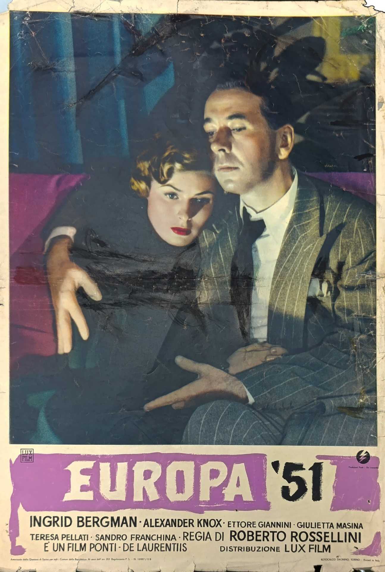 Europa 51, 1951 h cm 35X50 Ingrid Bergman, Roberto Rossellini. Piccoli strappi e riparazioni lungo i margini bianchi della cornice Ingrid Bergman, Roberto Rossellini. Piccoli strappi e riparazioni lungo i margini bianchi della cornice