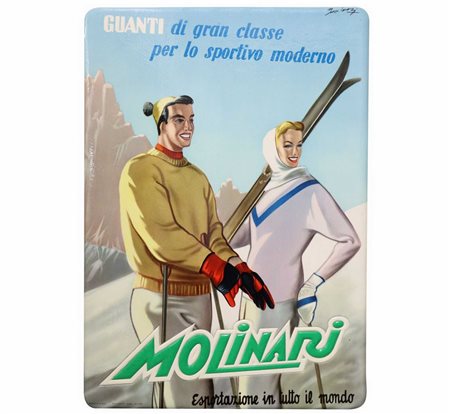Molinari - Cartonato da banco per guanti da sci, 1950s cm 33x23 Stampato a Milano. Con supporto posteriore. Presenti normali segni del tempoStampato a Milano. Con supporto posteriore. Presenti normali segni del tempo