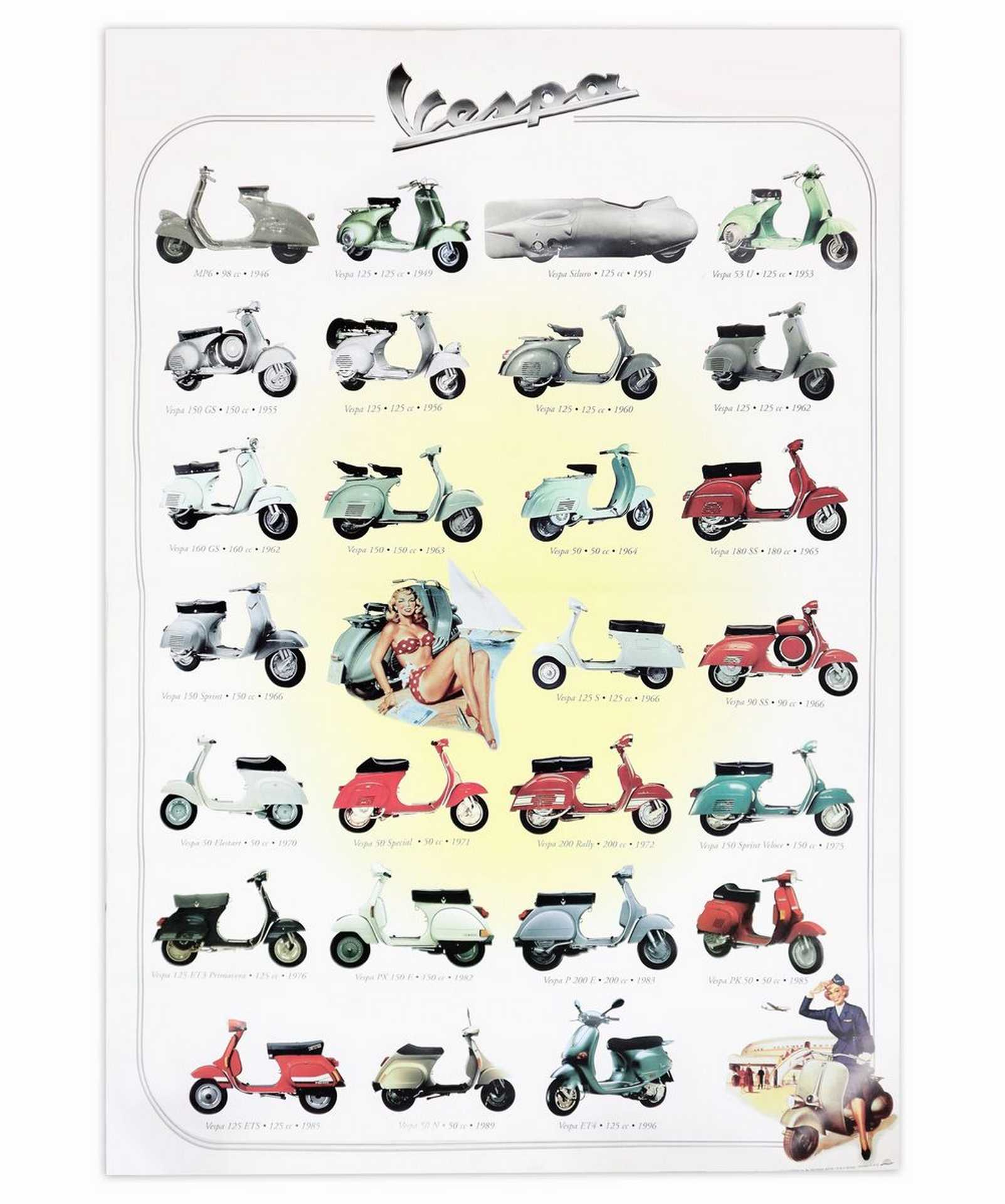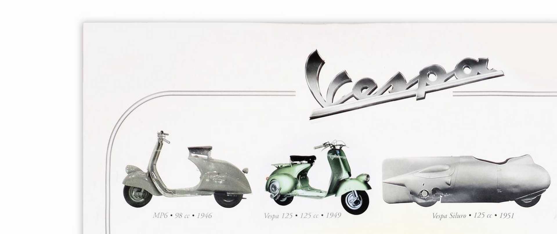 Arte Ricordi - Manifesto pubblicitario tutte le produzioni della Vespa, 1999 h cm 100x70 Modelli Vespa dal 1946 al 1996. Presenti normali segni del tempoModelli Vespa dal 1946 al 1996. Presenti normali segni del tempo