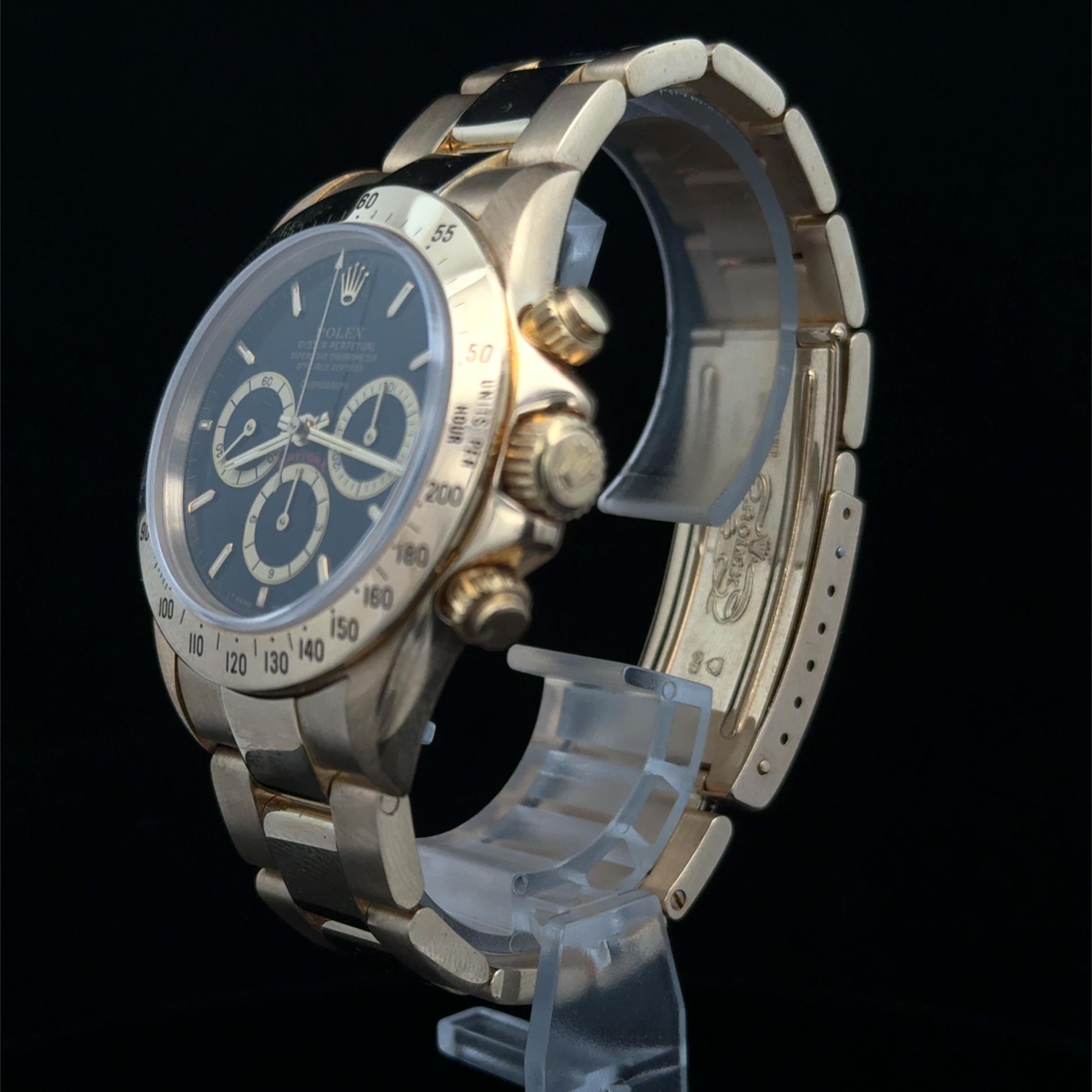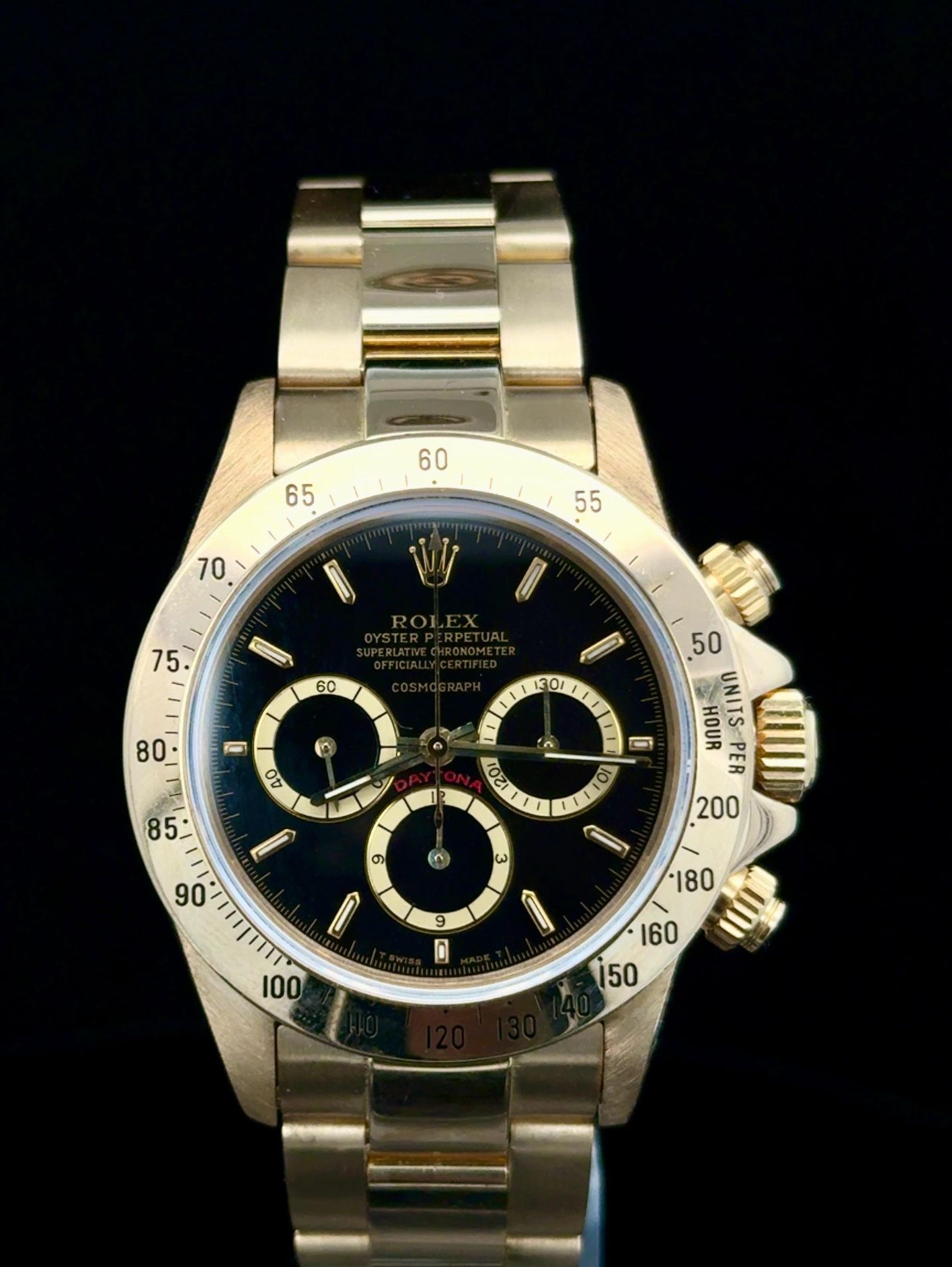 Marca Rolex Modello (Orologio) Daytona floating dial Numero di referenza 16528 Carica Automatico Materiale della cassa Oro giallo Materiale cinturino Oro giallo Anno di produzione 1989 Condizione Usato (Ottimo) Corredo Senza scatola originale né documenti originali Carica Automatico Calibro di base Zenith El Primero Materiale della cassa Oro giallo Diametro 40 mm Impermeabile 10 ATM Materiale lunetta Oro giallo Vetro Vetro zaffiro Quadrante Nero Numeri sul quadrante Senza numeri Cinturino Materiale cinturino Oro giallo Colore cinturino Oro Chiusura Déployante Materiale chiusura Oro giallo Funzioni Cronografo